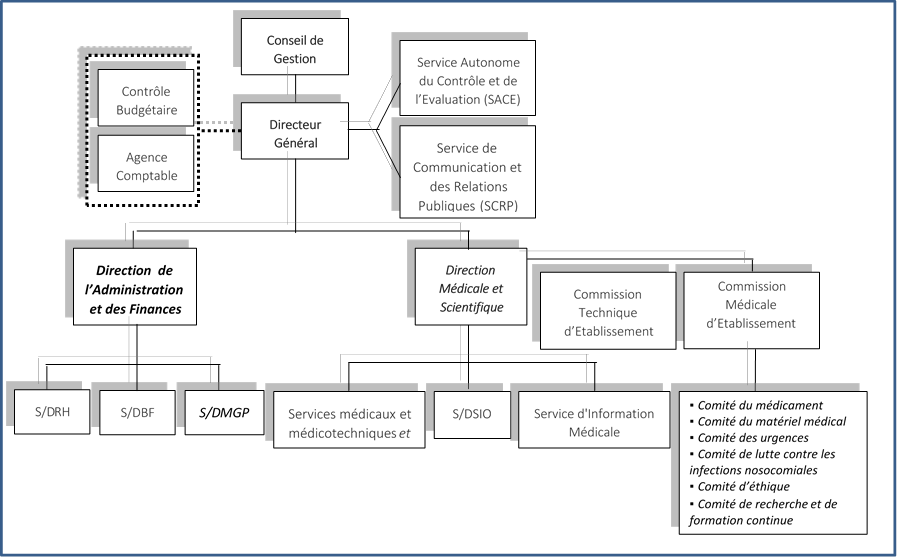 o un bâtiment principal de treize (13) niveaux, qui abrite les unités des soins (hospitalisation, salle des machines, des blocs opératoires imagerie médicale, stérilisation, salle d’accouchement, réanimation)